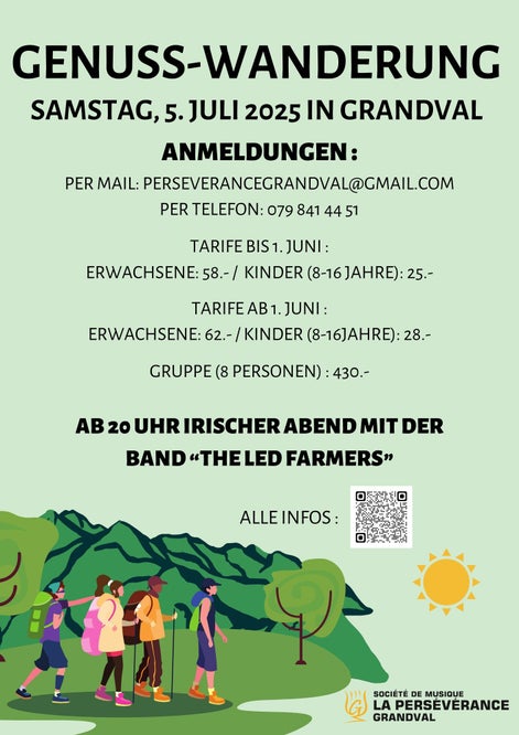 Wir freuen uns, Sie am Samstag, den 5. Juli 2025, in Grandval zu unserer Genuss-Wanderung einzuladen. Auf einem leicht hügeligen Rundweg von 6 km erwarten Sie 6 kulinarische Stationen. Kinderwagen sind herzlich willkommen. Nach der Wanderung laden wir Sie zu einem grossen irischen Abend auf der "Pâturage des moutons" ein – mit Konzerten, Verpflegung und Bar bis tief in die Nacht.