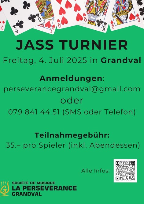 Grosses Jass-Turnier im Team – Freitag, 4. Juli 2025 in Grandval. Wunderschöner Gabentempel – jeder Teilnehmer erhält einen Preis. Die Anmeldung beinhaltet auch das Abendessen.
